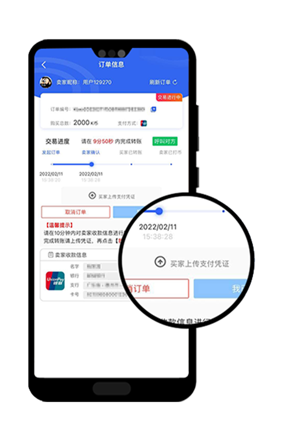 第五步:上传"支付凭证",并点击【我已转账】,等待卖家转币。